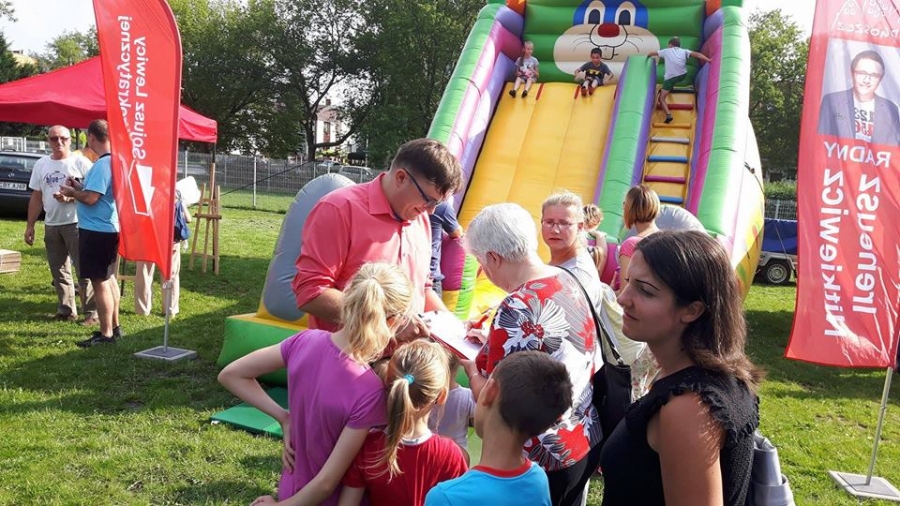 Podczas festynu zbieraliśmy podpis poparcia pod projektem darmowych przejazdów komunikacją miejską dla uczniów szkół podstawowych oraz za budową integracyjnego wodnego placu zabaw.