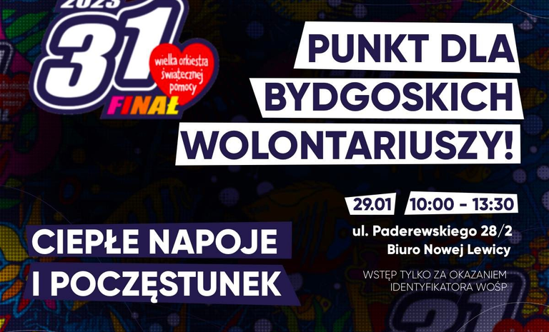 W orkiestrową niedzielę, bydgoscy działacze i sympatycy Nowej Lewicy zorganizują punkt wspierania wolontariuszy WOŚP. W siedzibie partii przy ul. Paderewskiego 28/2 przygotowane będę ciepłe napoje oraz drobny poczęstunek.