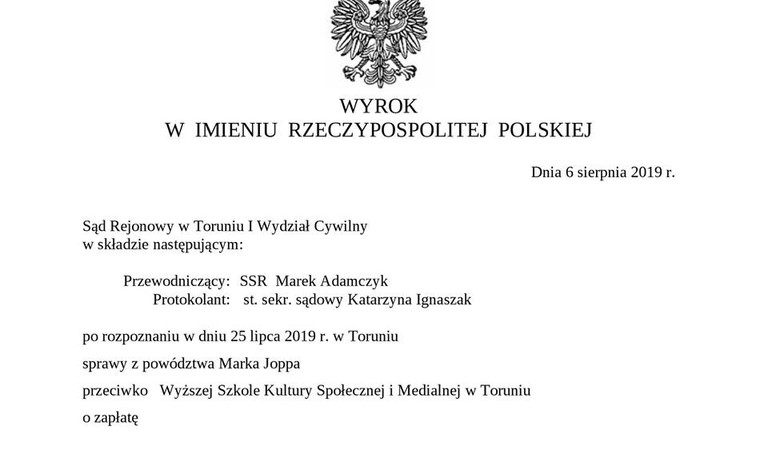 Wyższa Szkoła Kultury Społecznej i Medialnej pośrednio dyskryminowała Marka Joppa, wymagając od niego opinii od proboszcza przy przyjęciu na studia – taki wyrok zapadł ...